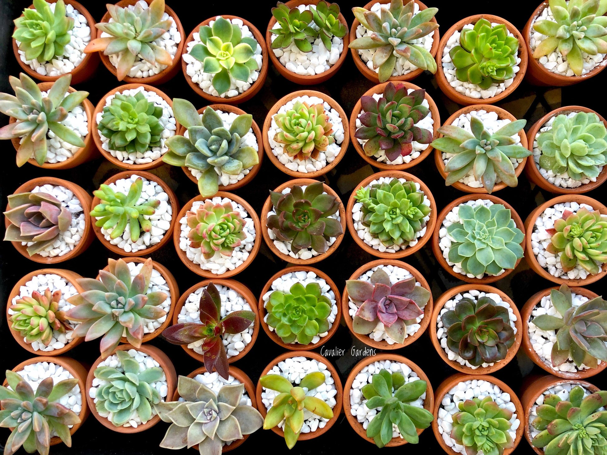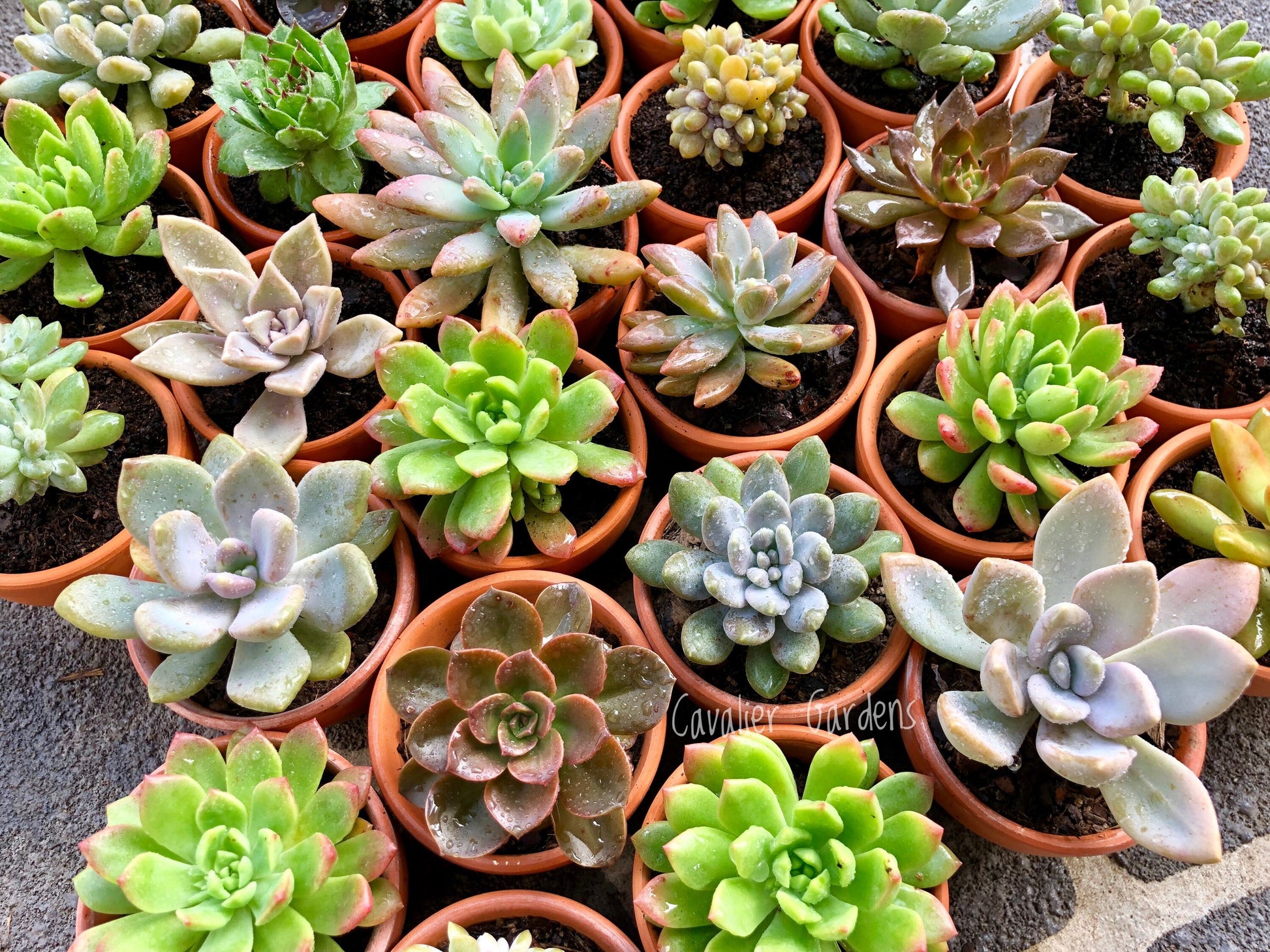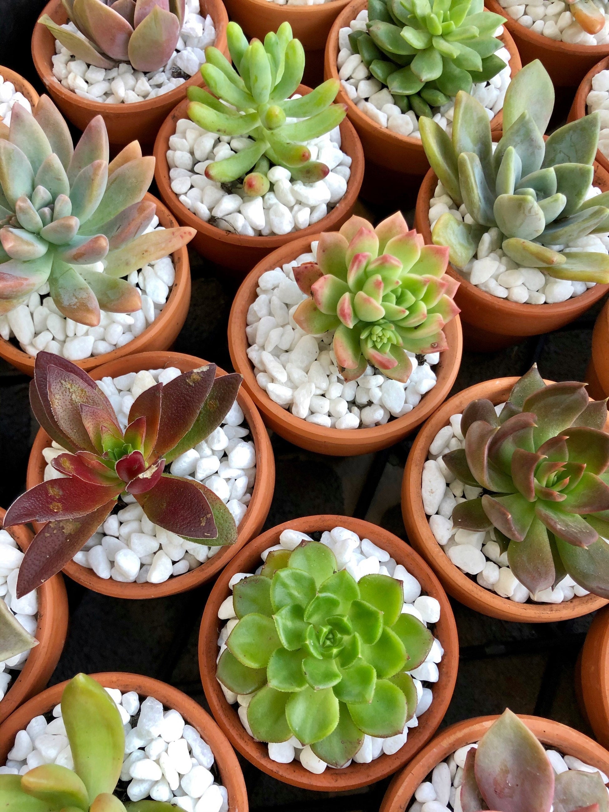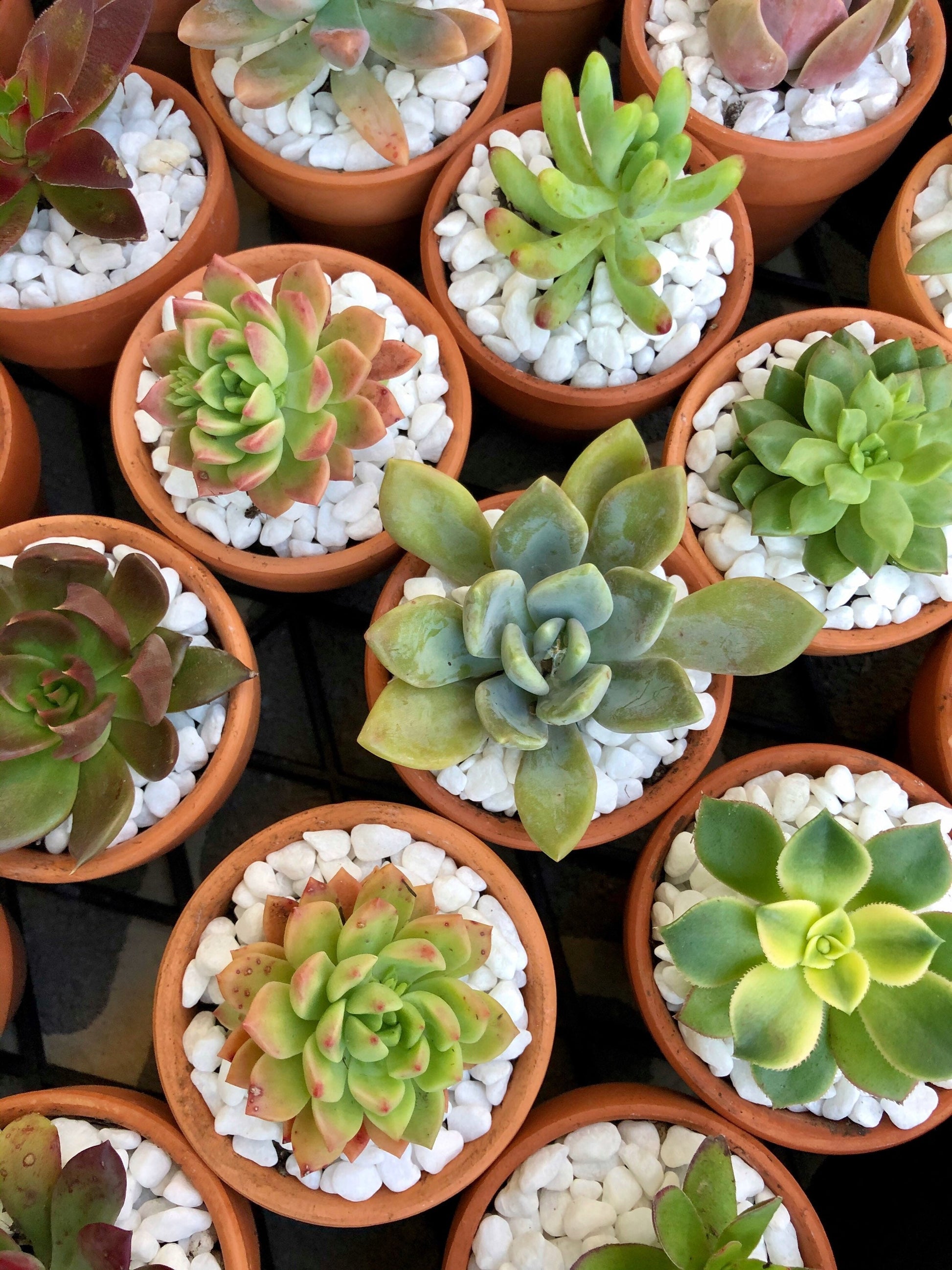 Succulent favours in 8cm terracotta pots and mixed succulents.